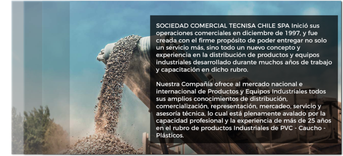 Más de 25 años de experiencia en el rubro de productos industriales de caucho-plástico y equipos avalan la capacidad profesional de TECNISA Chile. Su compromiso con la Calidad Total y las Normas ISO 9000 se refleja en cada uno de sus procesos, asegurando la satisfacción de sus clientes a nivel nacional e internacional.